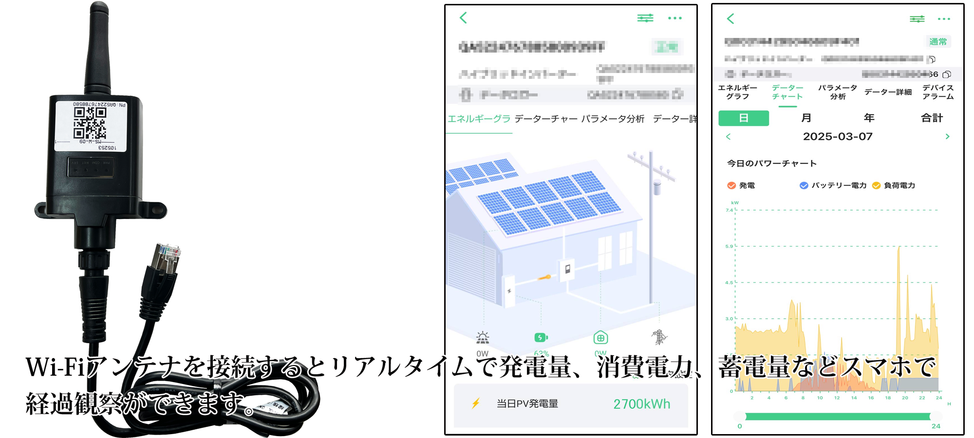 ES-8000IV・ES-5000IVシステムを遠隔から監視できます。お持ちのスマートフォンやタブレット端末に専用アプリをインストールしWi-Fiの設定を行えば発電状況、蓄電状況、使用状況などの監視が自由に行えます。
